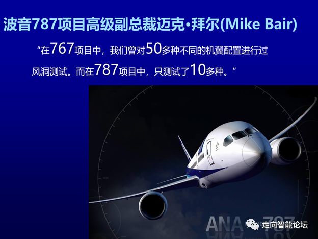 在波音787項(xiàng)目中,波音高級(jí)副總裁邁克拜爾提到,“在767項(xiàng)目中,我們?cè)鴮?duì)五十多種不同的機(jī)翼配置進(jìn)行過風(fēng)洞測(cè)試。而在787項(xiàng)目中,只測(cè)試了十多種?!敝粶y(cè)試過的十多種風(fēng)洞試驗(yàn)的787質(zhì)量更好的原因,就是因?yàn)樵跀?shù)字化的飛機(jī)外形的基礎(chǔ)上,完成了大量的CFD計(jì)算流體力學(xué)計(jì)算,減少了風(fēng)洞吹風(fēng)的次數(shù)。