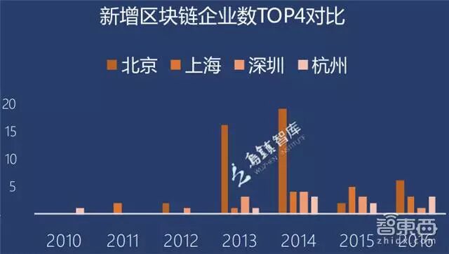 從創(chuàng)業(yè)時間節(jié)點來看,區(qū)塊鏈企業(yè)數(shù)量仍在不斷增長,其中2014年單年度新增區(qū)塊鏈企業(yè)數(shù)量最多。2013年和2014年,北京涌現(xiàn)出大量區(qū)塊鏈企業(yè);近兩年杭州在新增企業(yè)數(shù)量方面縮小了與京滬深之間的差距,并于2016年超過深圳。